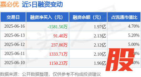 本站消息,6月16日,嘉必优(688089)融资买入1216.71万元,融资偿还2798.21万元,融资净卖出1581.5万元,融资余额1.97亿元股策略,近20个交易日中有11个交易日出现融资净买入。