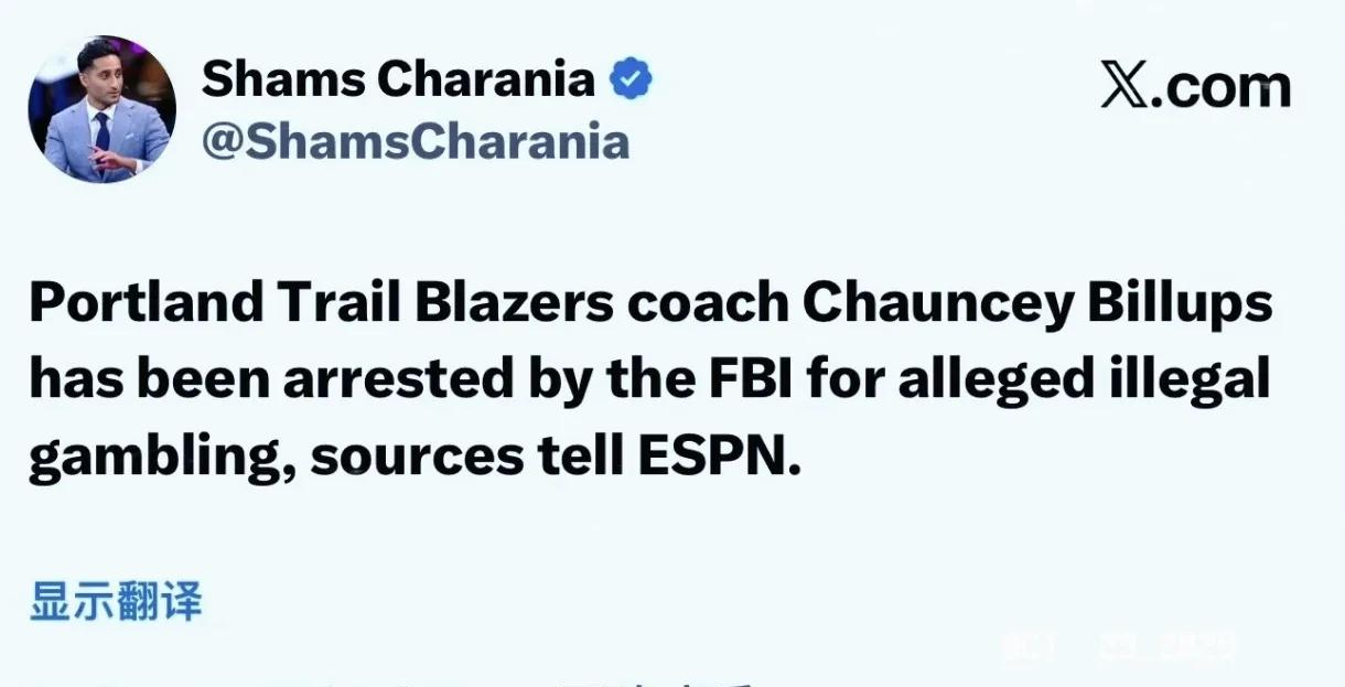 NBA明星shams第一时间报道了这个消息,他的原话是,波特兰开拓者队的主教练比卢普斯,已经被逮捕。除了他之外,还有热火队的球员罗齐尔。